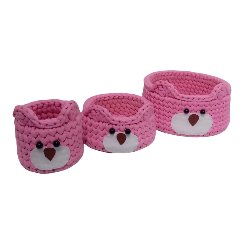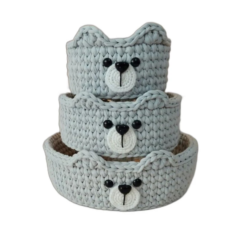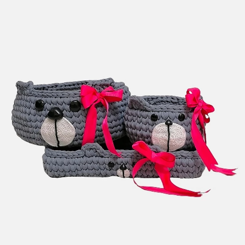 سبد وسایل کودک طرح خرسی مدل تریکو مجموعه 3 عددی (سبد دستبافت نظم دهنده وسایل )
