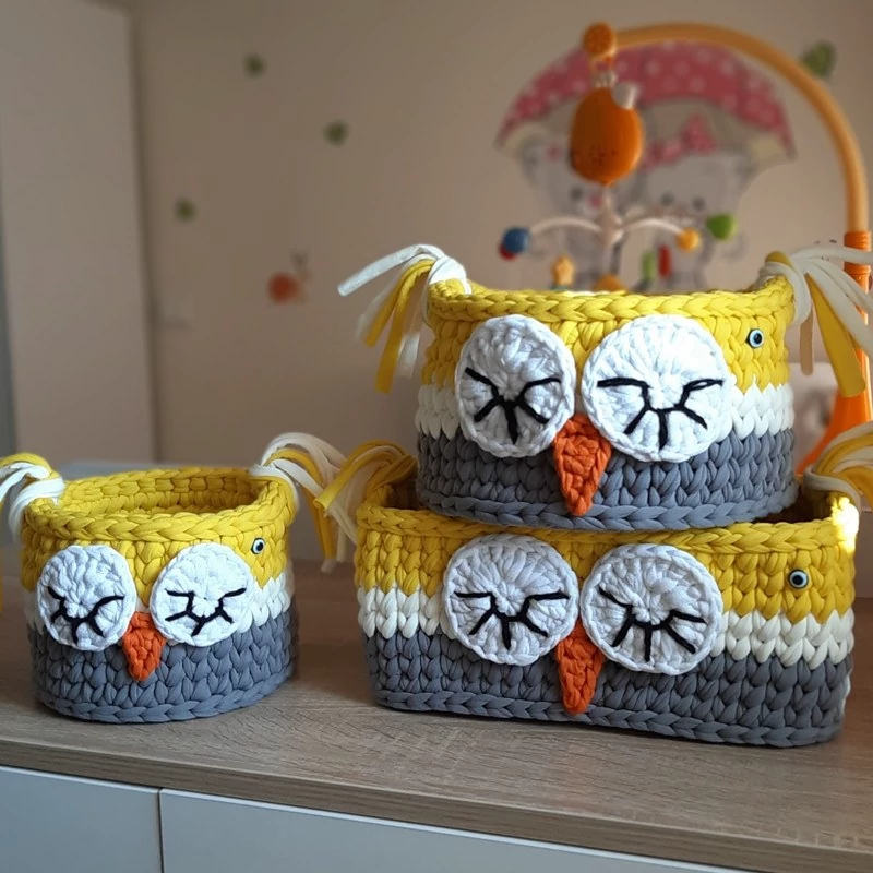 سبد وسایل کودک طرح جغد مجموعه 3عددی(سبد دستبافت نظم دهنده وسایل)