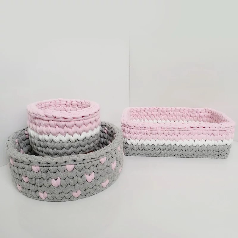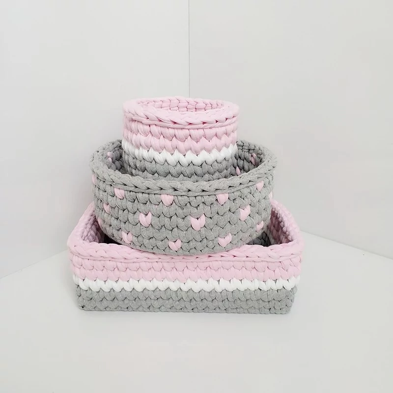 سبد قلاب بافی تریکو طرح سیسمونی مجموعه 3 عددی(سبد دستبافت نظم دهنده وسایل)