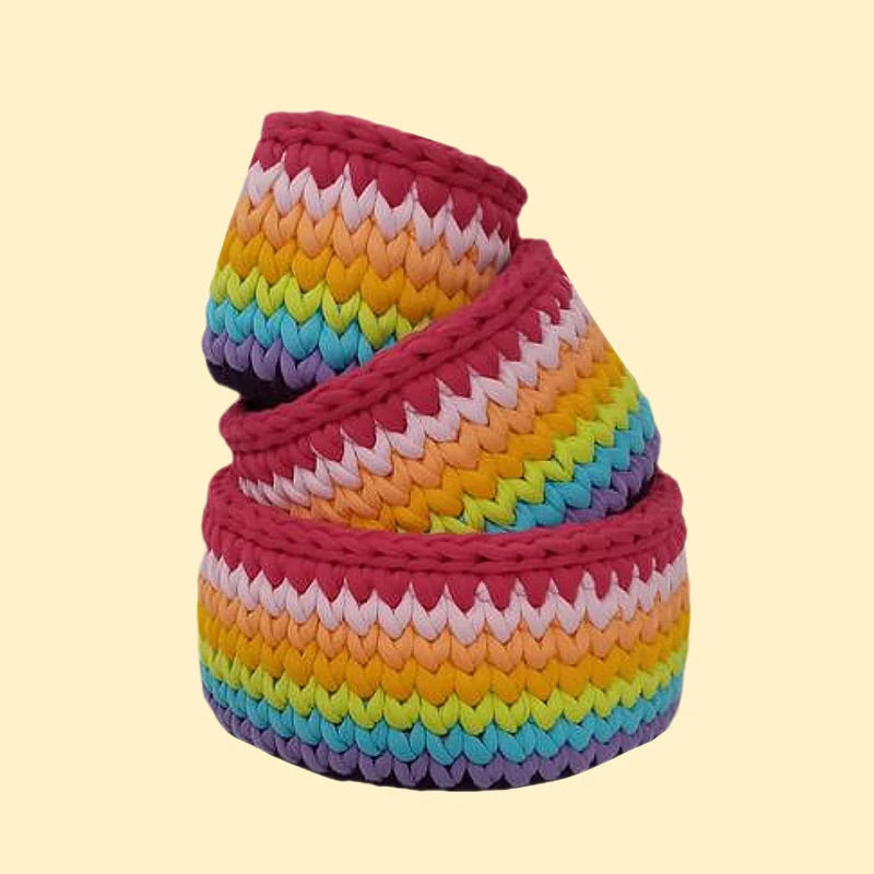 سبد قلاب بافی تریکو مجموعه 3 عددی میباشد .کیفیت بافت بالا بوده ، دیواره کار محکم و با استقامت و رنگبندی زیبایی دارد .ابعاد کار به قطر 20 و 15 و 10 سانتیمتر میباشد.